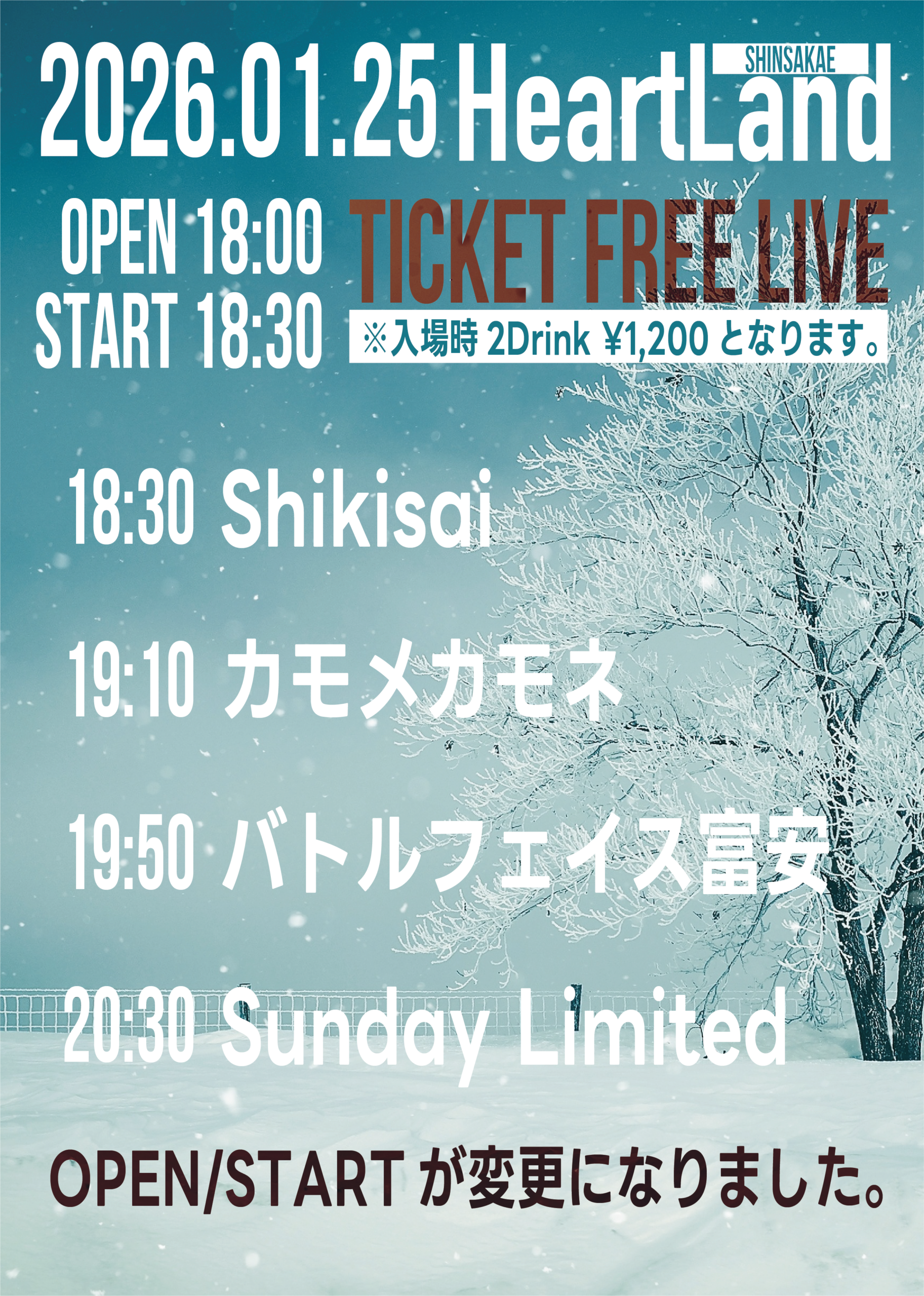 2026 1/25HeartLand FREE LIVE 時間open 18:00start 18:30 チケット 入場無料 [2D別¥1,200-] ※投げ銭 問合せ HeartLand/052-212-9018出演:Shikisai / Sunday Limited / バトルフェイス富安 / カモメカモネ Post 記事のタイトルとURLをコピーする スケジュール一覧