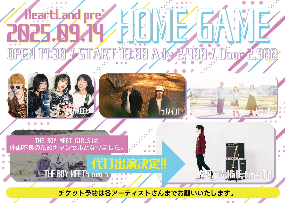 ※HOME GAMEに出演予定のTHE BOY MEETS GIRLSが体調不良のためキャンセルとなりました。ご了承ください。 代打出演として Half time Old鬼頭大晴が出演してくれることが決まりました。 宜しくお願いいたします。