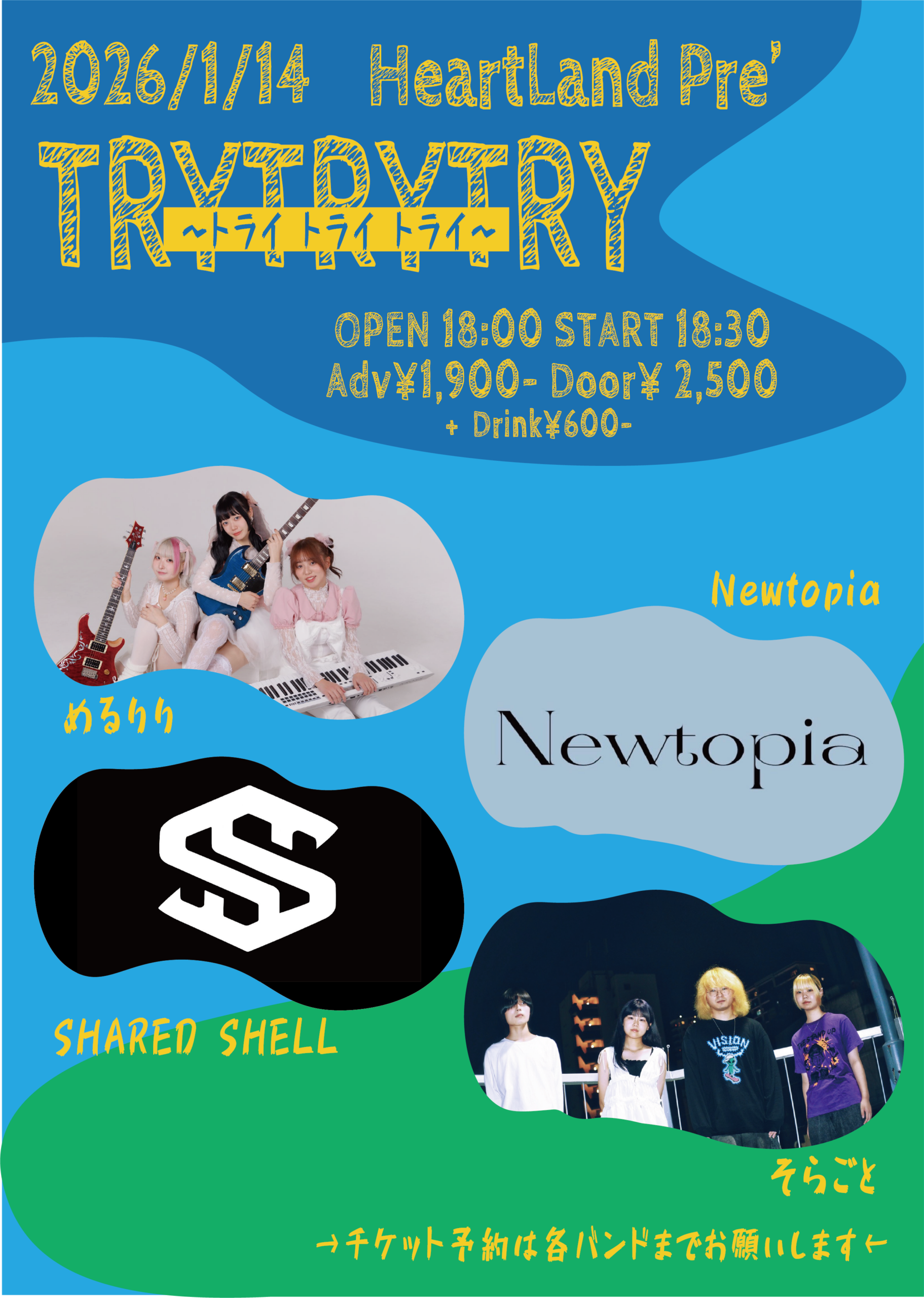 2026 1/14HeartLand 『TRY TRY TRY vol.3』 時間OPEN/18:00START/18:30 チケット 前売¥1,900- [ドリンク代別途¥600必要] 問合せ HeartLand/052-212-9018出演:Newtopia / そらごと / めるりり / SHARED SHELL Post 記事のタイトルとURLをコピーする スケジュール一覧