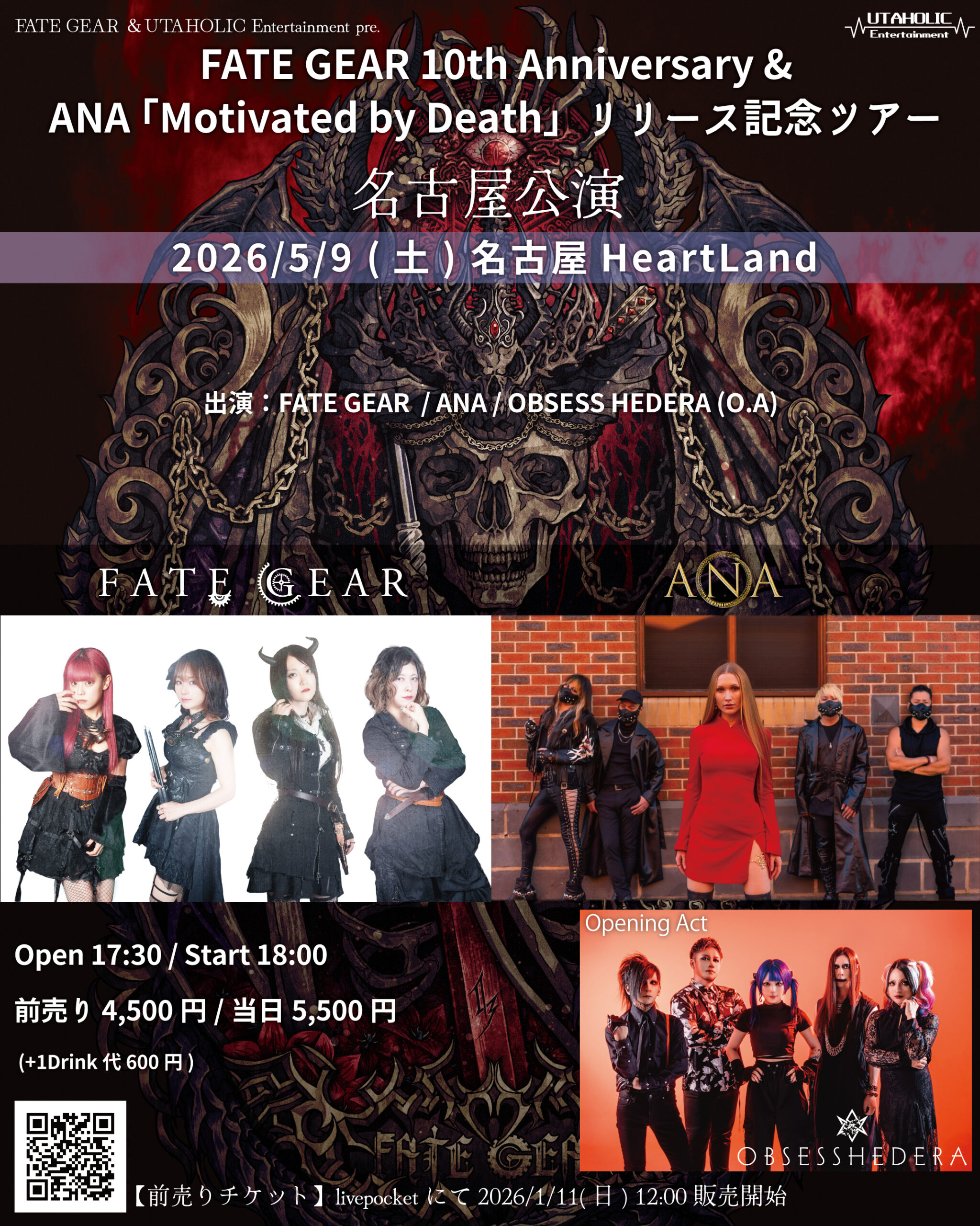 2026 5/9HeartLand FATE GEAR & ANA 時間OPEN/17:30START/18:00 チケット 前売¥4,500- [ドリンク代別途¥600必要] 問い合わせ HeartLand/052-212-9018FATE GEAR 10th Anniversary &ANA 「Motivated by Death」リリース記念ツアー 名古屋公演チケットはこちら Post 記事のタイトルとURLをコピーする スケジュール一覧