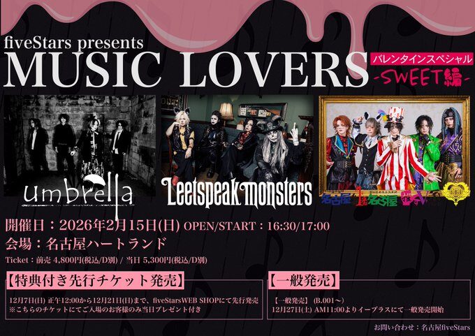 2026 2/15HeartLand fiveStars presents 「MUSIC LOVERS バレンタインスペシャル-SWEET編-」 時間OPEN/16:30START/17:00 チケット 前売¥4,800‐ [ドリンク代別途¥600必要] 問合せ 名古屋fiveStars出演:umbrella / Leetspeak monsters / 麗麗 Post 記事のタイトルとURLをコピーする スケジュール一覧 2026年2月15日 2026 2/15SPADE BOX 88Palette ♯1 出演:袈裟丸祐介 / 原口誠 / 伊沢ビンコウ / AotoOPEN/15:00START/15:30