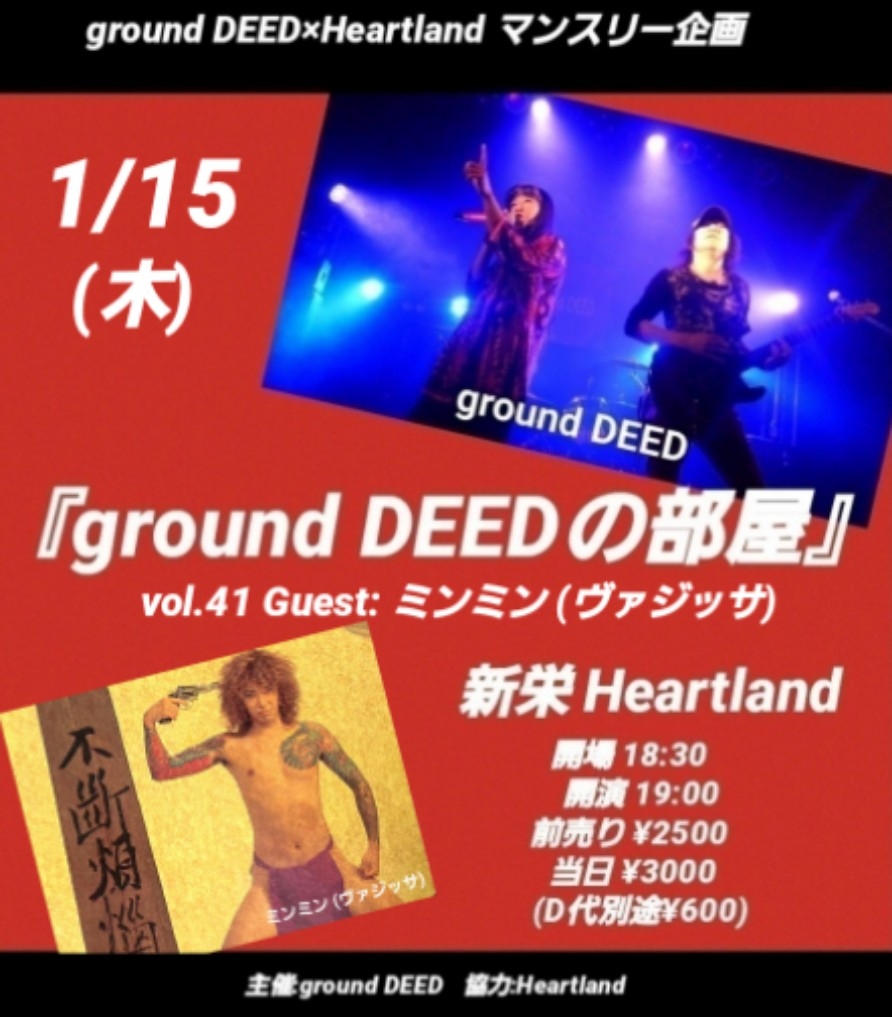 2026 1/15HeartLand ground DEEDの部屋 Vol.41 時間OPEN/18:30START/19:00 チケット 前売¥2,500-/当日¥3,000- [ドリンク代別途¥600必要] 問い合わせ HeartLand/052-212-9018出演:ground DEEDGuest:ミンミン(ヴァジッサ) Post 記事のタイトルとURLをコピーする スケジュール一覧