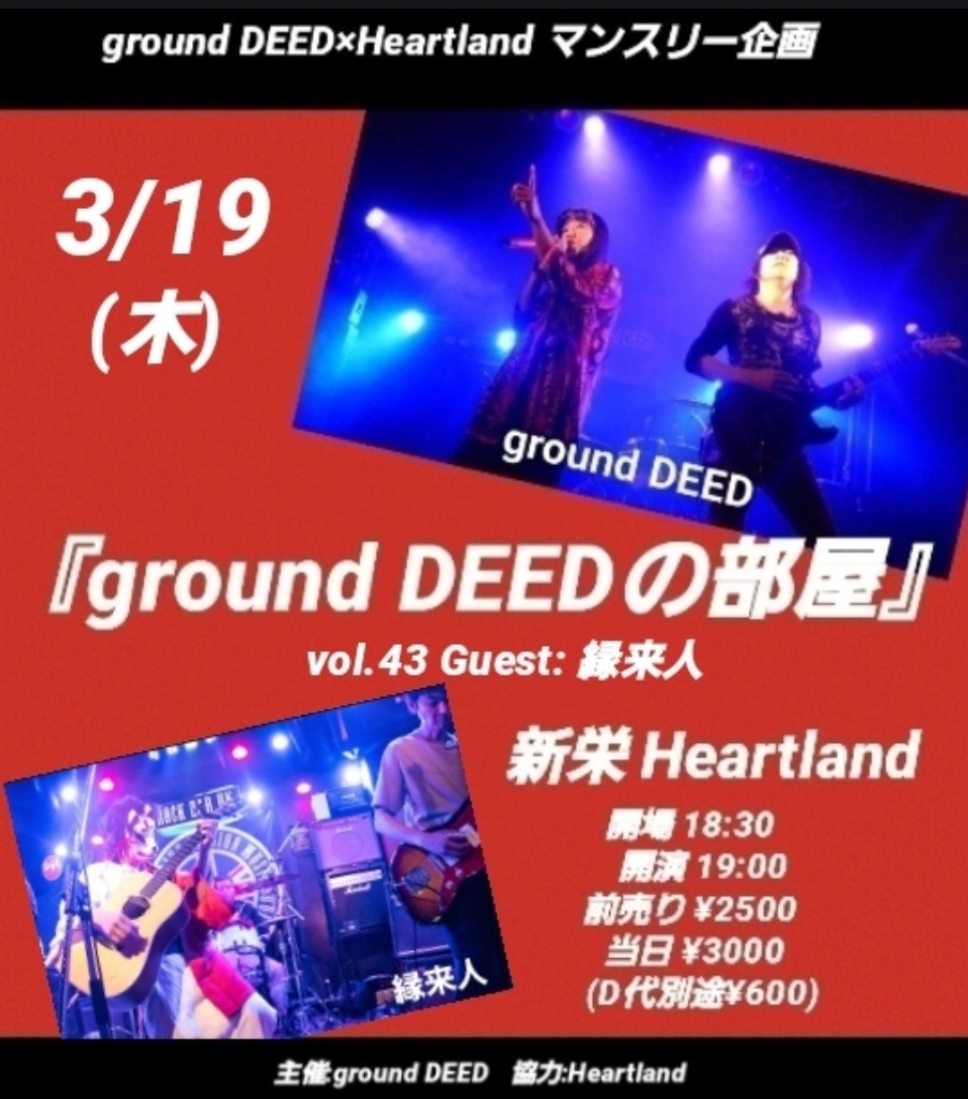 2026 3/19HeartLand ground DEEDの部屋 Vol.43 時間OPEN/18:30START/19:00 チケット 前売¥2,500-/当日¥3,000- [ドリンク代別途¥600必要] 問い合わせ HeartLand/052-212-9018出演:ground DEEDGuest:縁来人 Post 記事のタイトルとURLをコピーする スケジュール一覧 2026年3月19日 2026 3/19SPADE BOX 音楽食堂『Orange Sky』season30 出演:ORANCHE / 空知堂open 18:00start 18:30