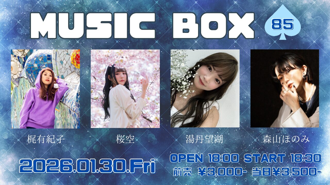 2026 1/30SPADE BOX MUSIC BOX 85 時間OPEN/18:00START/18:30 チケット 前売¥3,000- 当日¥3,500- [ドリンク代別途¥600必要] 配信 ¥1,000 問合せ SPADE BOX/052-212-9028出演:梶有紀子 / 桜空 / 湯丹望湖 / 森山ほのみチケット予約はこちら Post 記事のタイトルとURLをコピーする スケジュール一覧 2026年1月30日 2026 1/30HeartLand Suzumushi プレゼンツ BREAK WITH ME!! トークショーありの2マンライブ 出演:Suzumushi / 小林右京OPEN/19:00START/19:30