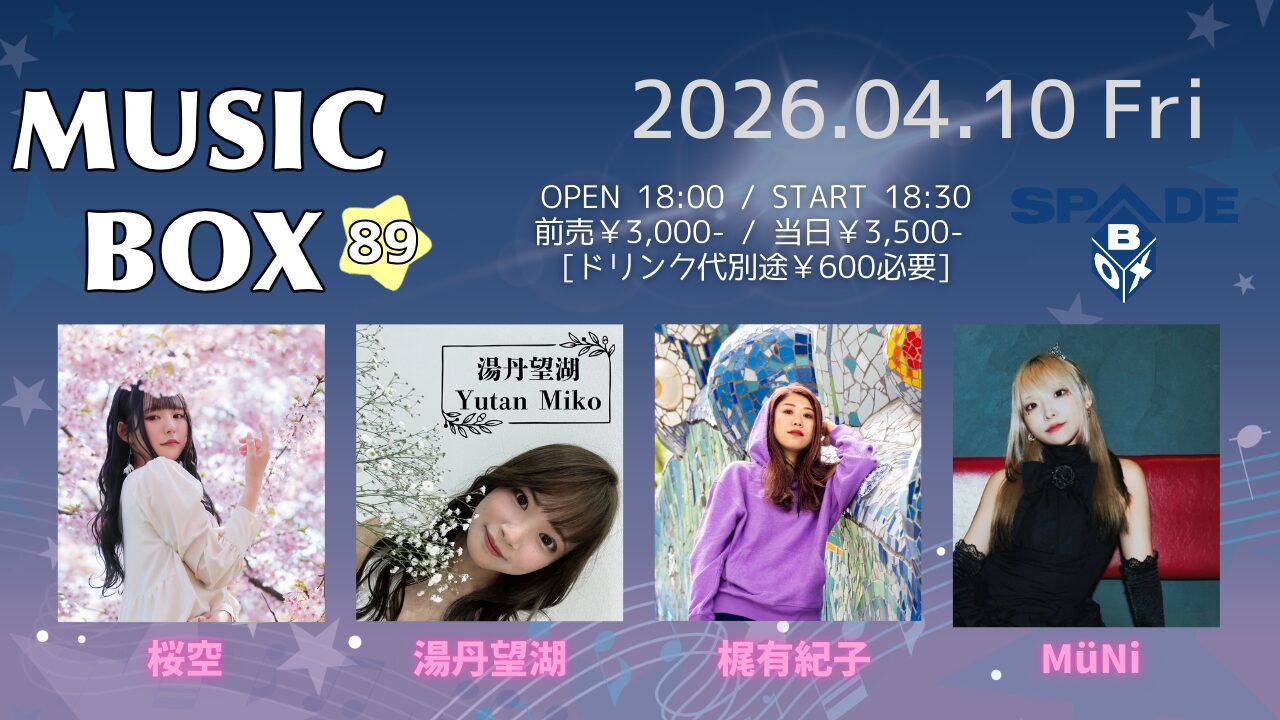 2026 4/10SPADE BOX MUSIC BOX 89 時間OPEN/18:00START/18:30 チケット 前売¥3,000- 当日¥3,500- [ドリンク代別途¥600必要] 配信 ¥1,000 問合せ SPADE BOX/052-212-9028出演:桜空 / 湯丹望湖 / 梶有紀子 / MüNiチケット予約はこちら Post 記事のタイトルとURLをコピーする スケジュール一覧 2026年4月10日 2026 4/10HeartLand ビビビ☆ビールズ 出演:THEビールズ / ORANCHE / シャリテンKd (エアギター) / 一人バンドshogoOPEN/18:00START/18:30