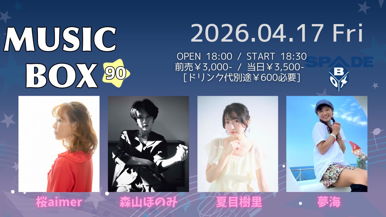 2026 4/17SPADE BOX MUSIC BOX 90 時間OPEN/18:00START/18:30 チケット 前売¥3,000- 当日¥3,500- [ドリンク代別途¥600必要] 配信 ¥1,000 問合せ SPADE BOX/052-212-9028出演:森山ほのみ / 桜aimer / 夢海 / 夏目樹里チケット予約はこちら Post 記事のタイトルとURLをコピーする スケジュール一覧 2026年4月17日 2026 4/17HeartLand Suzumushi プレゼンツ BREAK WITH ME!! トークショーありの2マンライブ 出演:Suzumushi / holoyoiOPEN/19:00START/19:30
