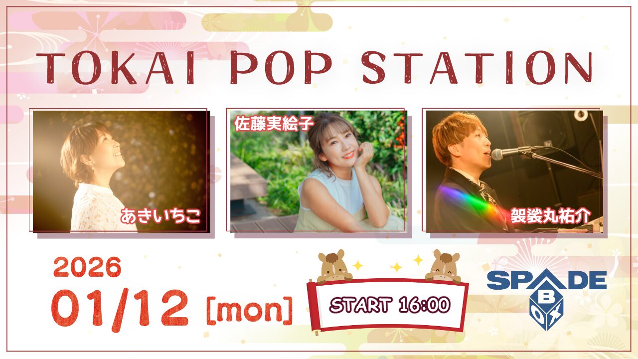 2026 1/12SPADE BOX TOKAI POP STATION 時間OPEN/15:30START/16:00 チケット 前売¥3,500-/当日¥4,000- [ドリンク代別途¥600必要] 配信 ツイキャス¥2,000- 問い合わせ HeartLand/052-212-9018出演:佐藤実絵子 / あきいちこ / 袈裟丸祐介 Post 記事のタイトルとURLをコピーする スケジュール一覧