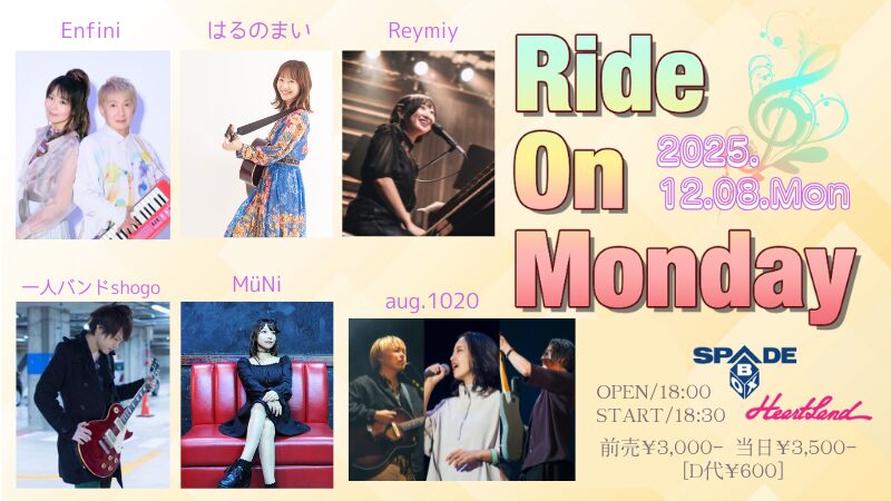 2025 12/8SB&HL Ride On Monday 時間OPEN/18:00START/18:30 チケット 前売¥3,000-/当日¥3,500- [ドリンク代別途¥600必要] 配信 配信¥1,000- ツイキャス 問い合わせ HeartLand/052-212-9018出演: 一人バンドshogo / MüNi / Enfini / aug.1020 / はるのまい / Reymiy Post 記事のタイトルとURLをコピーする スケジュール一覧