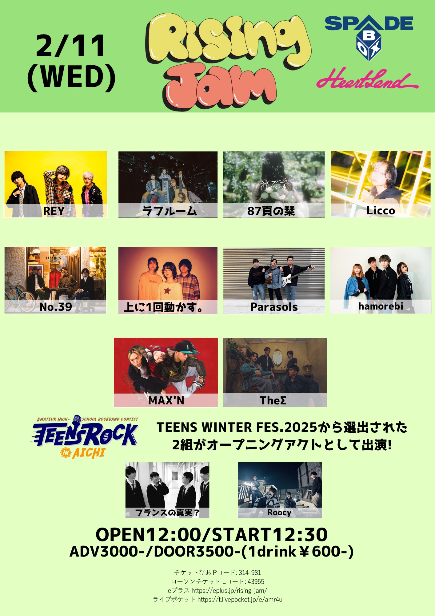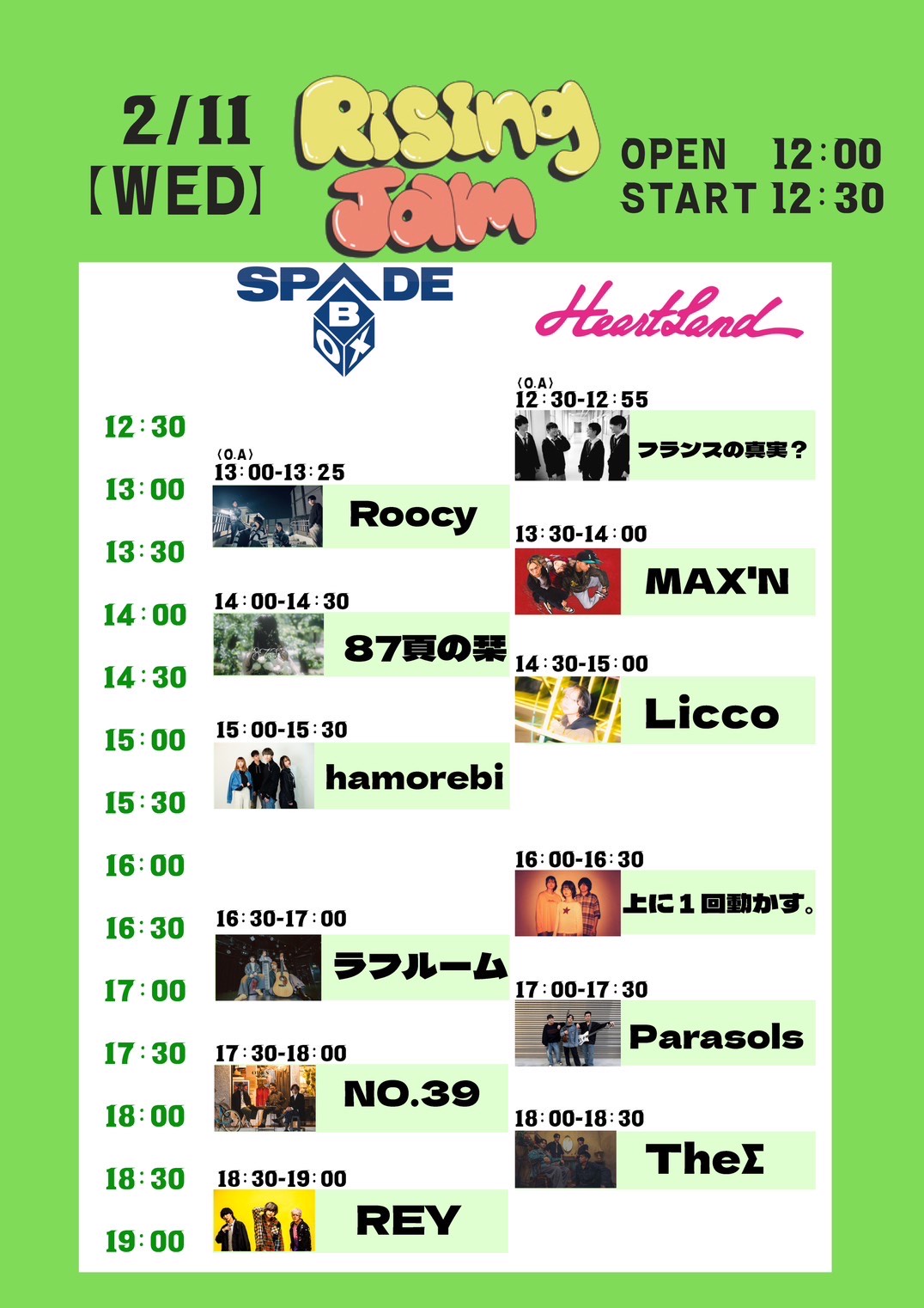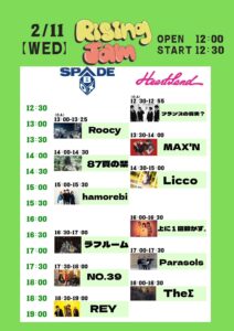 2026 2/11SB&HL Rising Jam 時間OPEN 12:00START 12:30 チケット 前売¥3,000- / 当日¥3,500-[ドリンク代別途¥600必要] 配信 ツイキャス¥1,000- 問い合わせ Heartland/052-212-9028出演:No.39 / REY / 87頁の栞 / ラフルーム / hamorebi / Parasols / Licco / MAX’N(マクスン) / 上に一回動かす。 / TheΣO.A:フランスの真実? / Roocy Post 記事のタイトルとURLをコピーする スケジュール一覧