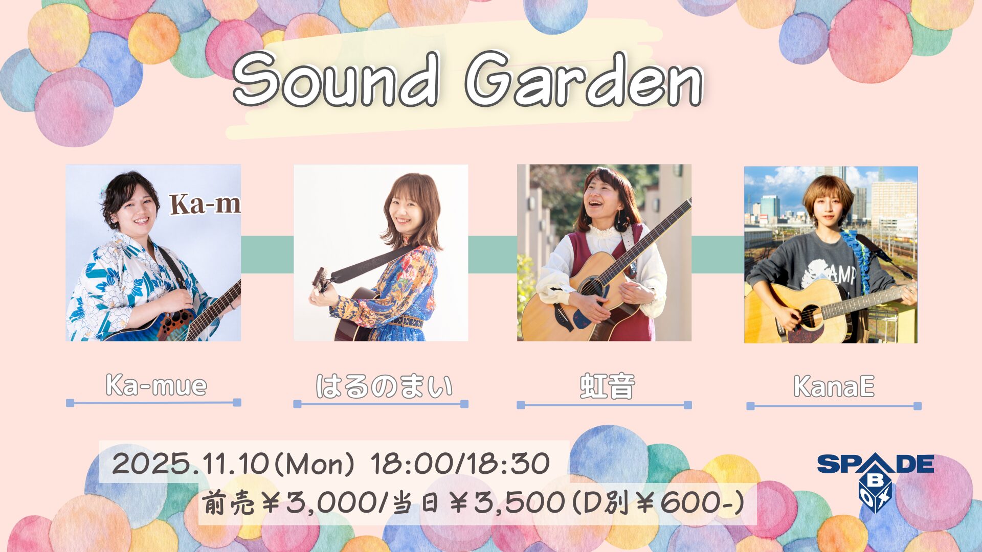 2025 11/10SPADE BOX Sound Garden 時間OPEN/18:00START/18:30 チケット 前売¥3,000- 当日¥3,500- [ドリンク代別途¥600必要] 配信 ¥1,000- 問合せ SPADE BOX/052-212-9028出演:Ka-mue / はるのまい / 虹音 / KanaE Post 記事のタイトルとURLをコピーする スケジュール一覧 2025年11月10日 2025 11/10HeartLand 松田樹利亜【Impulse 2025】 ゲスト:久松史奈詳しくはこちらopen/18:30start/19:00