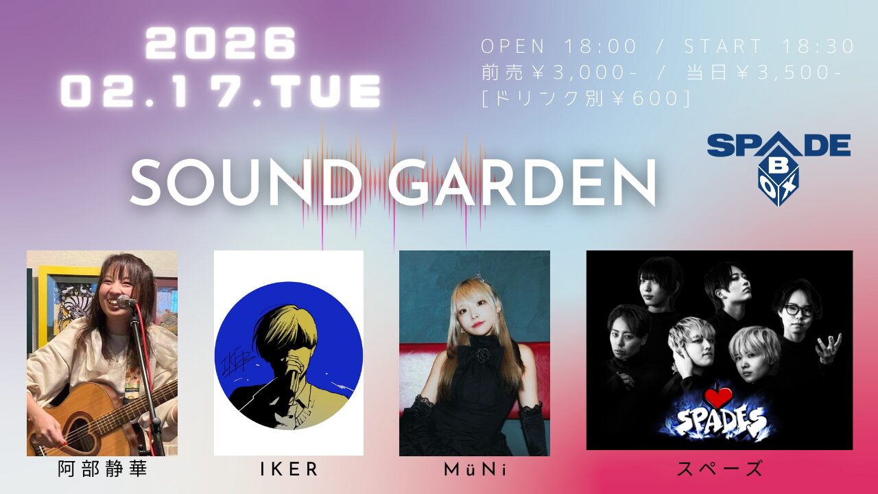 2026 2/17SPADE BOX Sound Garden 時間OPEN/18:00START/18:30 チケット 前売¥3,000- 当日¥3,500- [ドリンク代別途¥600必要] 配信 ¥1,000- 問合せ SPADE BOX/052-212-9028出演:阿部静華 / IKER / スペーズ / MüNi Post 記事のタイトルとURLをコピーする スケジュール一覧